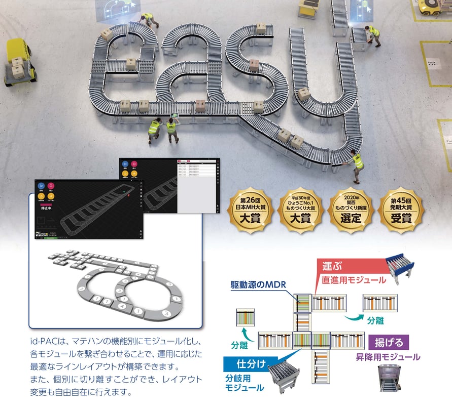 id-PACはパソコン上のアイコンを選んでならべるだけで、簡単にコンベヤのレイアウト設計や搬送制御設定が行える技術者不足を支援する新技術です。